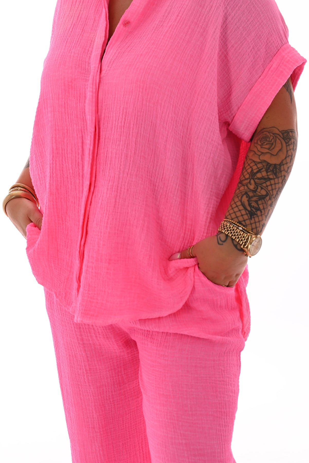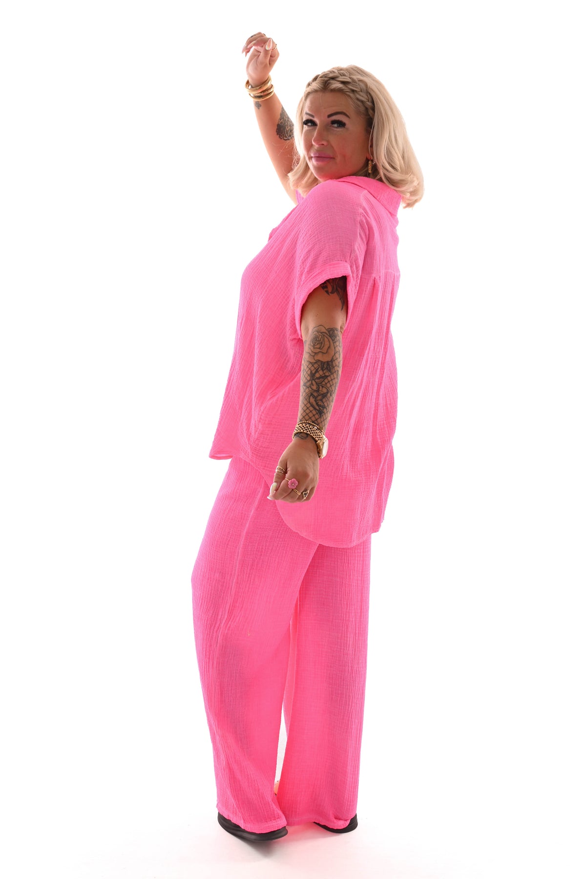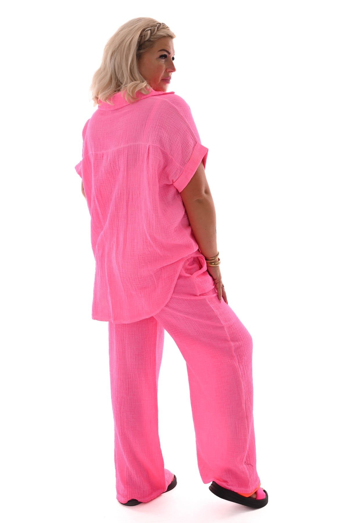 Dieses zweiteilige Waffelset ist die perfekte Mischung aus Komfort und Stil. Es ist aus einem luftigen, weichen Waffelstoff gefertigt, der sich angenehm auf der Haut anfühlt. Die lockere Passform und der minimalistische Look machen es ideal für entspannte Tage, zu Hause oder unterwegs. Kombinieren Sie es mit Slippern oder Turnschuhen für einen mühelosen, femininen Look.